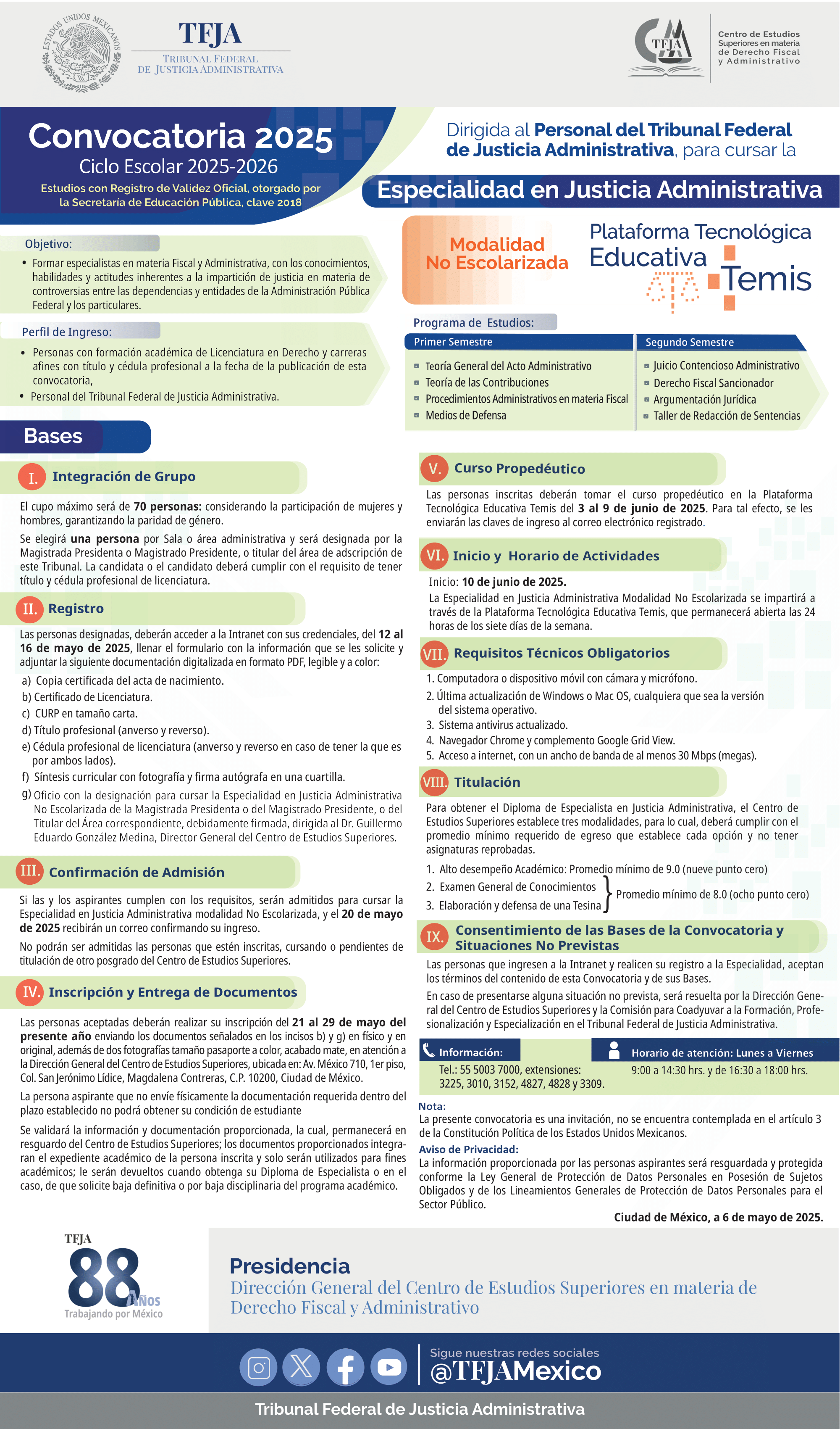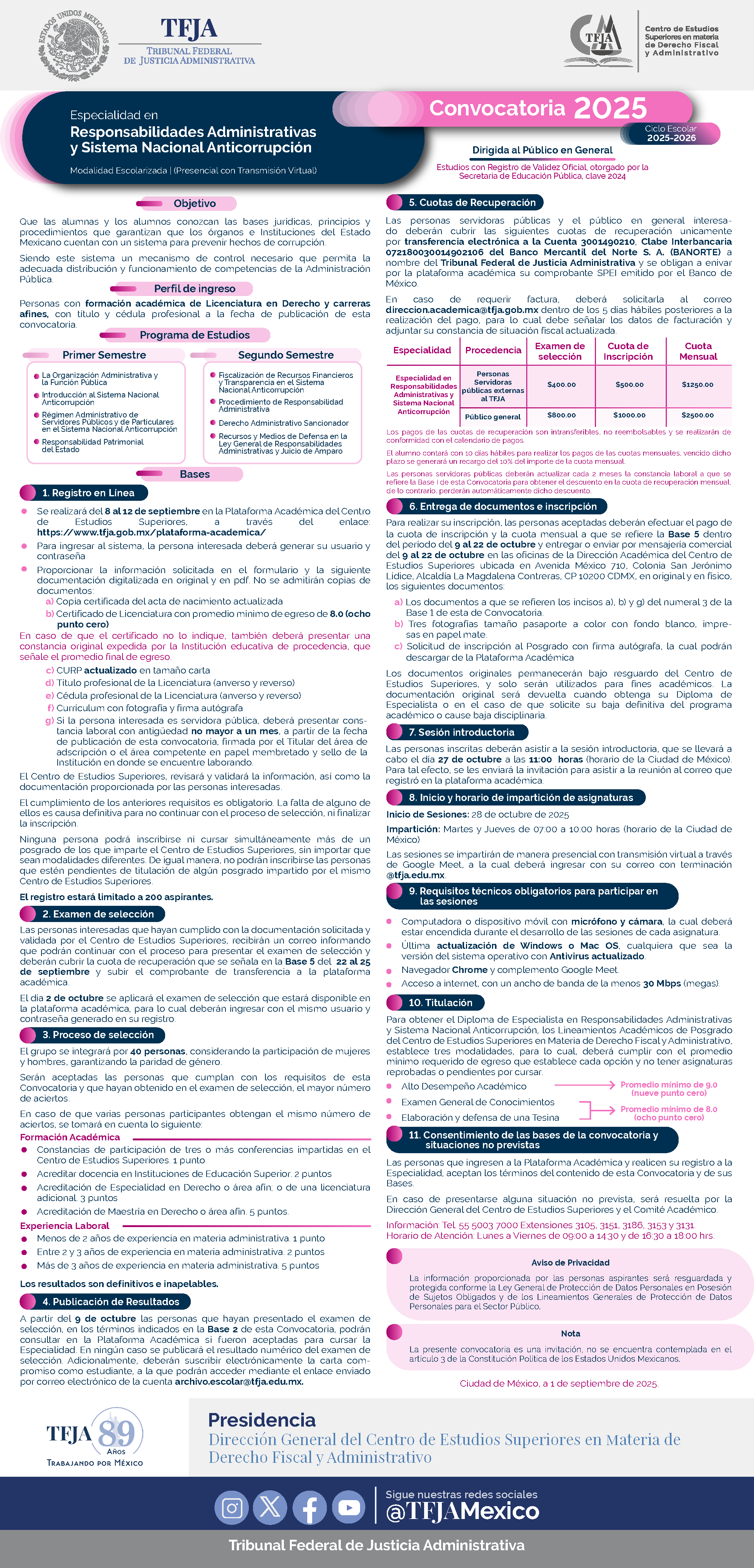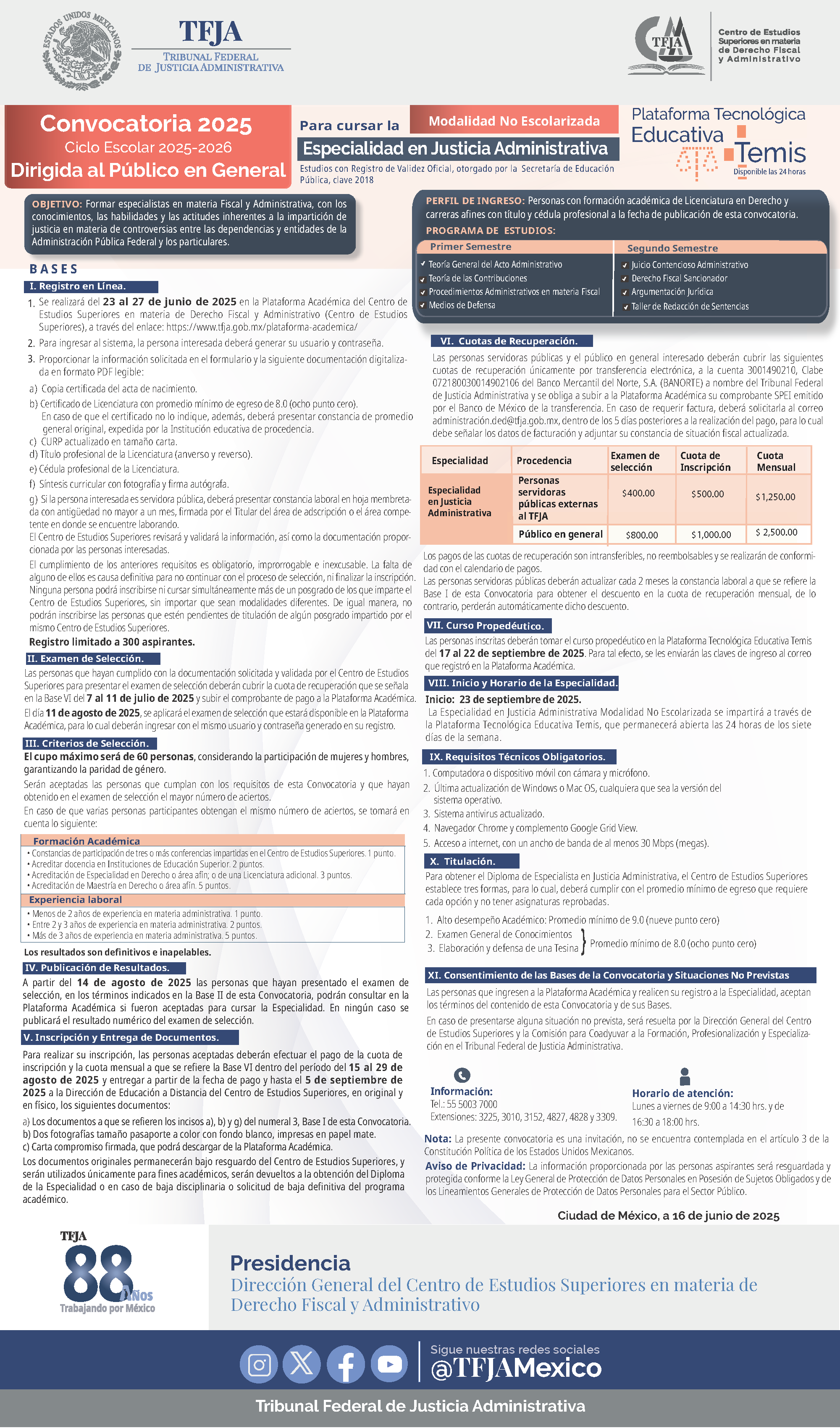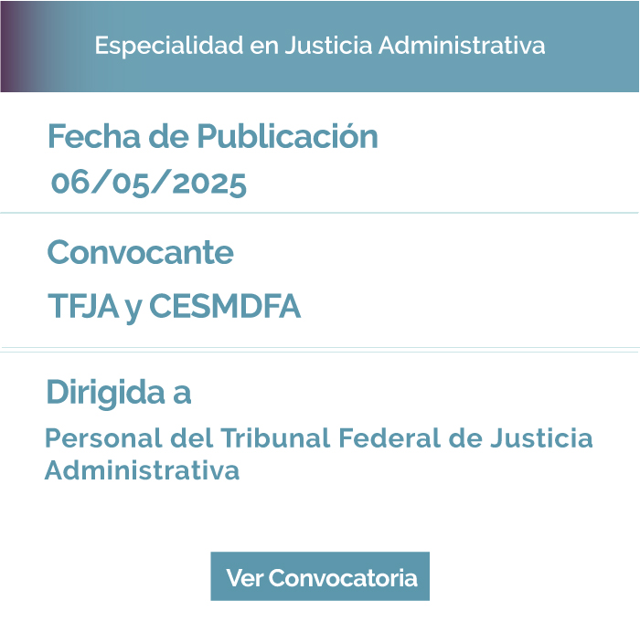Desde aquel año y en forma ininterrumpida se impartió el curso señalado y, gracias a la aceptación e interés que ha mantenido hasta la fecha, no sólo de parte de las personas que laboran dentro del Tribunal, sino también de licenciadas y licenciados en derecho no pertenecientes al Tribunal, quienes tienen acceso a él, desde el año 2012 se convirtió en un programa de posgrado, cambiando su nombre a Especialidad en Justicia Administrativa, con validez oficial de estudios, clave 2011, con fundamento en el Convenio de Colaboración celebrado entre el Tribunal Federal de Justicia Administrativa y la Secretaría de Educación Pública, de 15 de diciembre de 2010.